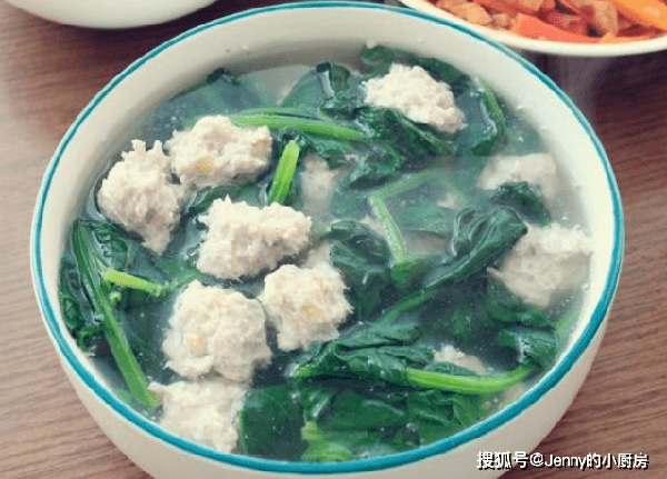 接着转中火继续煮,煮到丸子熟透。最后放入菠菜,煮半分钟,再加少许盐调味,这道汤就做好了。
