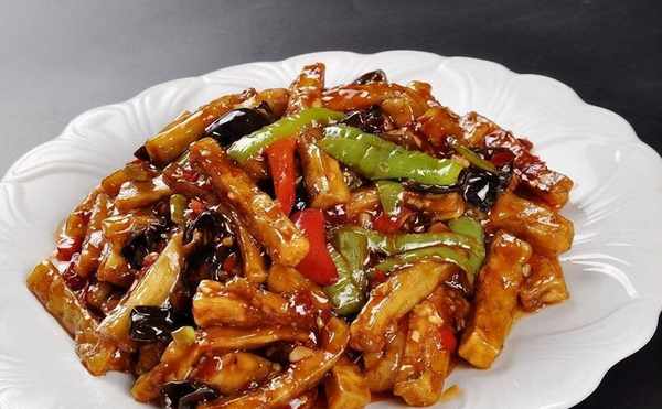 材料:长茄子;青椒;番茄;葱;蒜;姜;植物油;盐;淀粉;糖;