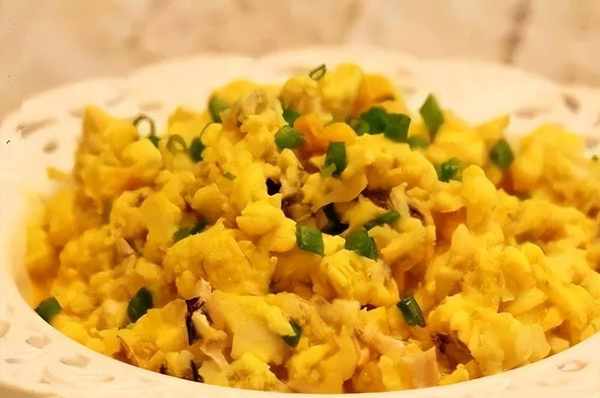 原料:鸡蛋5个,油80克,香醋1汤匙,绍兴酒1茶匙,葱姜末少许,盐、味精适量。