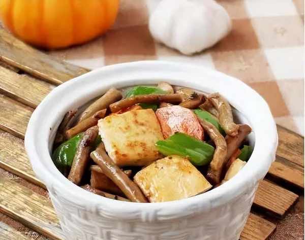 材料:豆腐200克、茶树菇300克、蚝油、盐、姜、青椒1条、红萝卜1条