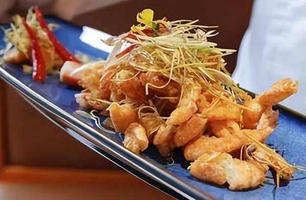 2、将挑选好的鲜虾撒上酥皮面糊,放入烧热的油锅中炸至表皮酥脆紧实;切碎新鲜的柠檬草,炸至金黄。