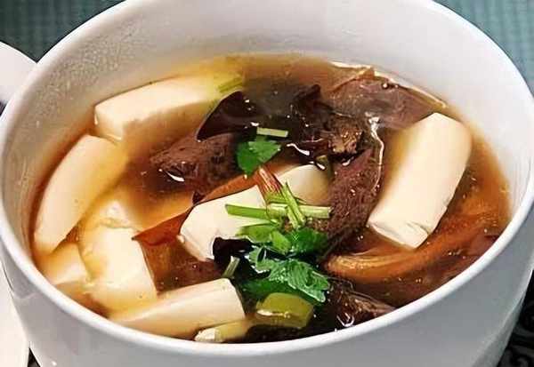 原料:鸭血150克、豆腐100克、泡香菇、黄花菜、葱、姜、盐、酱油15毫升、香醋15毫升、鸡精、胡椒粉、香菜