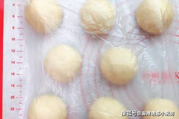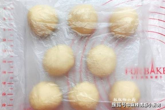 7.把面团分成8等份,滚圆后盖上保鲜膜以防表皮风干,松弛10分钟