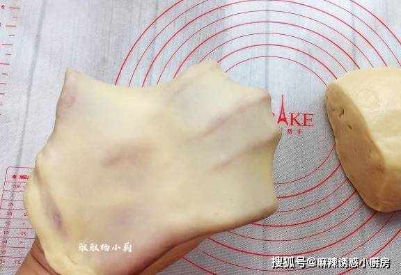 6.然后看一下状,揉成光滑的面团,揉至完成扩展,可拉出薄而有韧性的手套膜