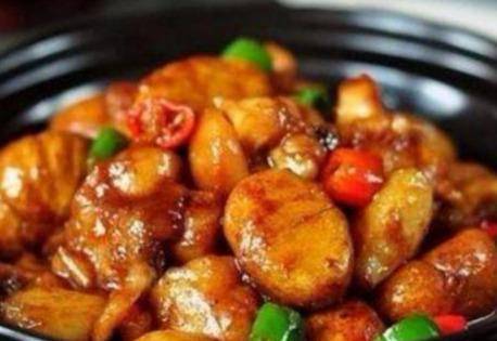 4.倒入热水,大火烧开,然后用小火将鸡肉焖煮,文火煮6分钟,香菇去蒂,笋干切片,栗子入锅,煮熟。鸡肉酥脆,栗子软糯。能。