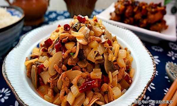 配料表:白蘑菇、咸菜、瘦肉、料酒、酱油、生粉、胡椒粉、大蒜、干辣椒
