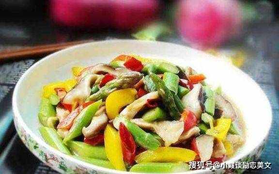 材料:芦笋250克,红辣椒1/3条,黄辣椒1/3条,鲜香菇4朵