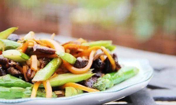 5、锅烧热,倒入橄榄油,油热后放入蒜片炒香;加入胡萝卜和香菇,翻炒片刻;加入芦笋、适量盐,翻炒片刻;加少许水,继续炒,芦笋慢慢变翠绿,水慢慢干,加少许poutine,翻炒均匀,大功告成,起锅~