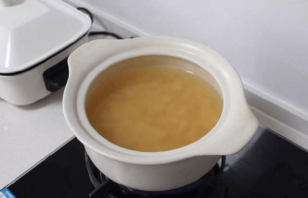 4、开大火将砂锅中的水烧开,然后转小火熬制1小时左右,中间不断用勺子搅拌,然后加入适量的红糖,用勺子搅拌均匀即可出锅食用。