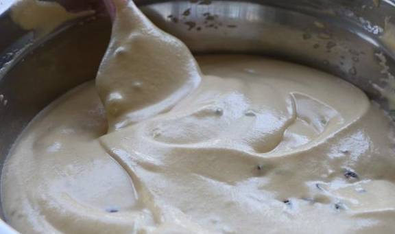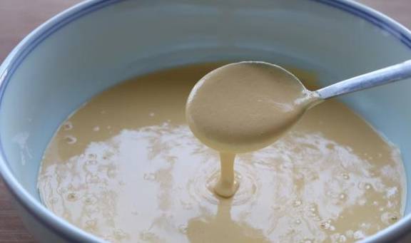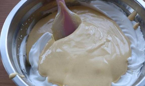 7、先分一部分蛋白霜到米糊里,翻拌均匀,再倒入剩下的蛋白霜里,继续翻拌均匀;