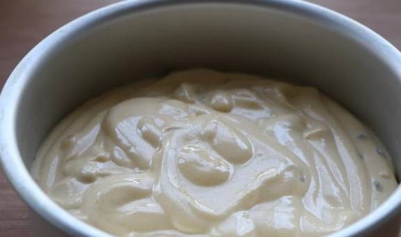 9、搅拌好的米糊倒入6寸戚风模具里,盖上保鲜膜或是倒扣一个深盘上去,隔水蒸大约35分钟;