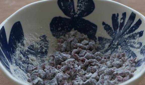 3、蔓越莓干切的小一点,然后加入1勺面粉拌均匀,其余的面粉漏勺漏掉;