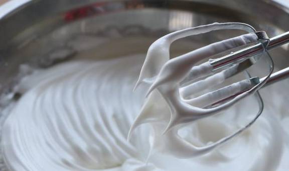 6、3个蛋清装在无油无水的盆里,分次加入35克白糖,打发至提起打蛋器有小尖角即可;