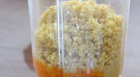 4、浸泡好的小米捞出,放入料理杯中,加入3个蛋黄;