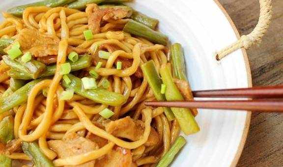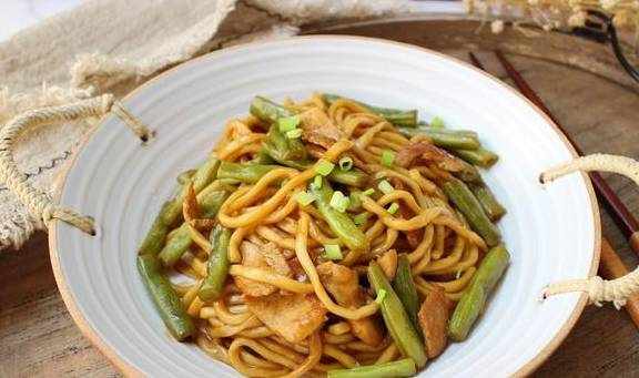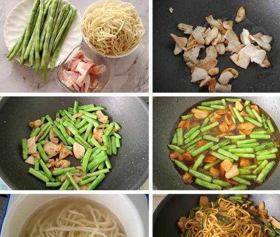 [食材]:豆角1把,鸡蛋面适量,五花肉适量,生抽,老抽,盐,白糖,胡椒粉,香葱少许
