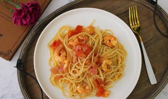 [食材]:意大利面1把,虾仁少量,番茄酱2勺,胡椒粉少许,洋葱少量,火腿丁少量,番茄1个,橄榄油适量,盐少许