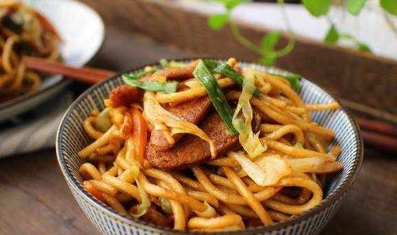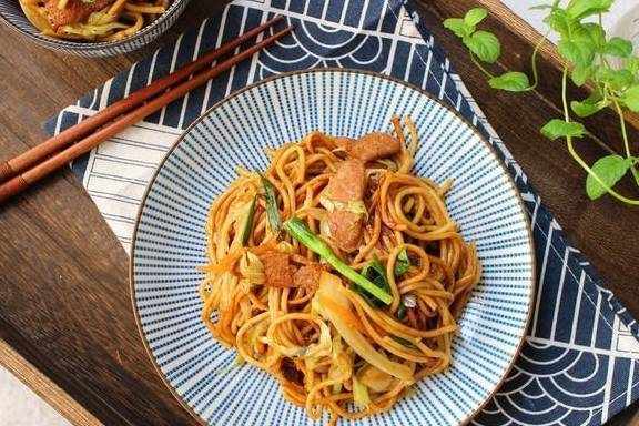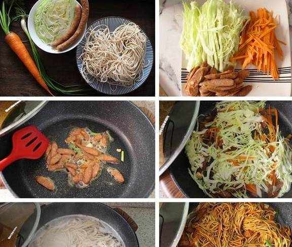 [食材]:碱水面200g,胡萝卜一根,包菜半个,香肠2根,香葱少量,生抽1勺,老抽1勺,蚝油2勺,糖半勺,盐少许