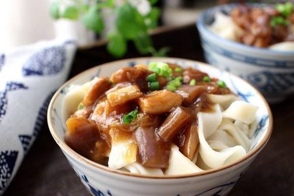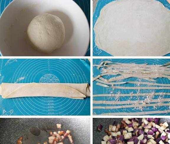 [食材]:面粉300g、水120g、五花肉1块、茄子2根、水淀粉适量、生抽适量、蚝油1勺、香葱少许