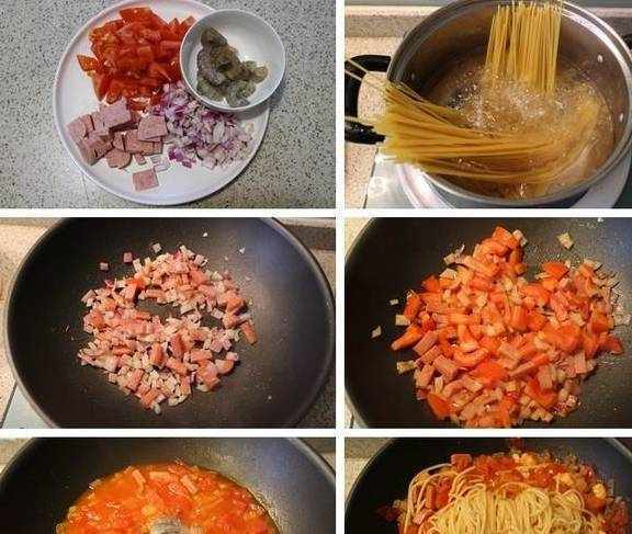 4.炒锅加少许油,把洋葱末倒入锅中炝出香味,倒入番茄碎翻炒出汁,再倒入番茄酱一起炒,加入虾仁,意大利面,火腿丁加少许胡椒粉,少许盐炒几分钟。出锅撒一些黑胡椒即可。