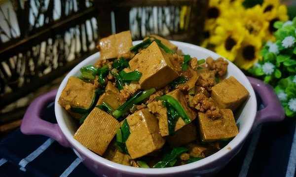 5、放入豆腐,搅拌速度不要太快,加入一小碗水,3汤匙酱油,2克盐,小火煮至汤汁收干。