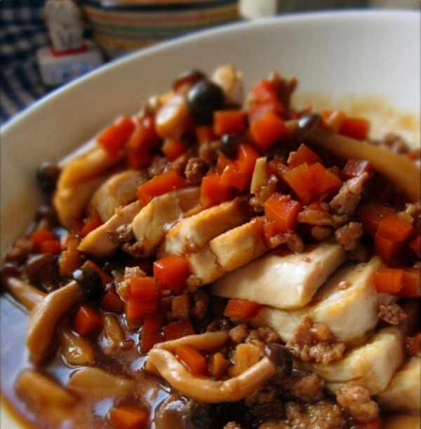 配料:北豆腐100克,肉末50克,胡萝卜50克,蟹肉菇(或其他蘑菇)50克,婴儿有机酱油2茶匙(10毫升),蒜末1茶匙(5毫升),油;