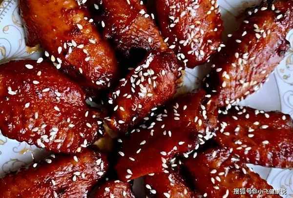 4.晾干后汤汁变成天然蜜汁。把鸡翅放在盘子里,撒上白芝麻。