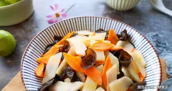 4.将胡萝卜炒软,加入葱、白洋葱、山药和黑蘑菇,中火翻炒。加入盐和半茶匙生抽,加水炖2分钟。在从锅中取出之前,用文火煮至原料变干。