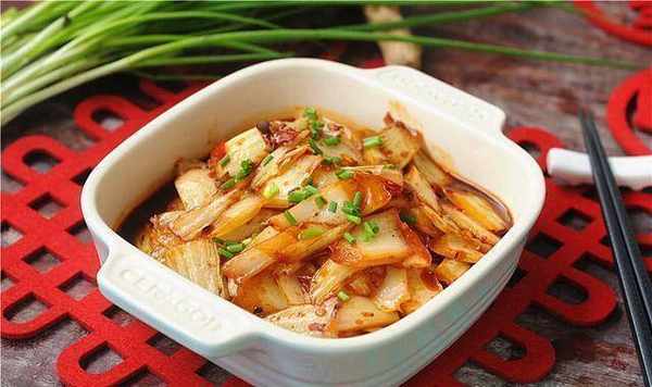 2.小葱、姜、蒜、红辣椒切碎待用,小葱、葱、白葱分别切碎(出锅前放葱)3、锅内倒入油,70%热后加入葱白、姜末、蒜末翻炒,加一勺烧烤酱爆红油提味提色,最后倒入白菜并用大火翻炒。