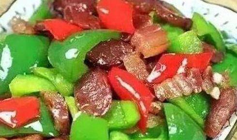 2:油烧热后将大蒜炒香,将咸肉炒至透明,加入青红椒翻炒;