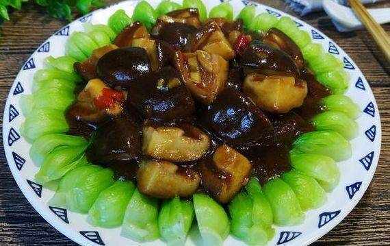 最后加入少许淀粉水煮至汤汁浓稠。将炸香菇与汤混合,放在青菜中间。