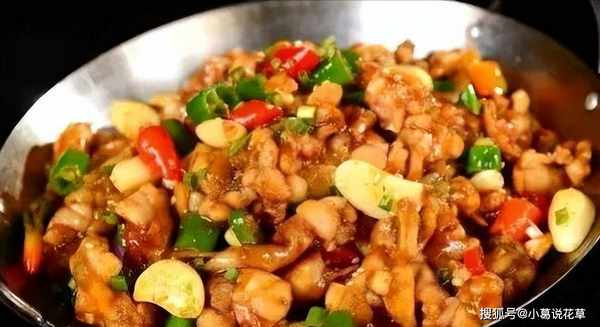 3、锅中加入适量的油烧热,加入姜2片、蒜瓣2瓣、花椒1克炒香,然后加入切好的鸡肉继续炒香,再加入干辣椒翻炒。-油炸。