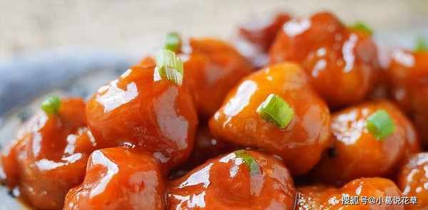 4.回到中火使酱汁变稠。酱汁煮熟后,加入炸好的肉片,炸至每一块都沾满酱汁,即可熄火上桌。撒上葱花,樱桃肉就完成啦!