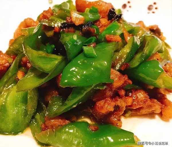 加入切碎的肉炒一会儿,然后加入切碎的青椒炒。