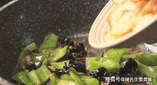 青椒、木耳切成块,大蒜剁成蒜末。倒出刚才炸瓜片的油,在锅中留一点底油即可。将锅烧热,将木耳和青椒倒入,进行翻炒。翻炒半分钟后倒入少量生抽提味,为了防止干锅,可以加入适量清水。
