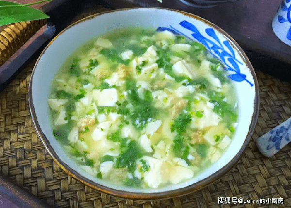 接着加入热水,大火煮两分钟,再放入荠菜、豆腐。