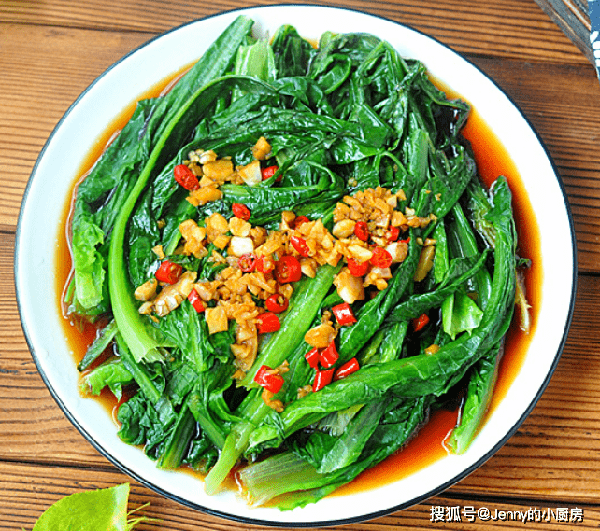 煮开后将蒜水浇在油麦菜上,这道菜就做好了。