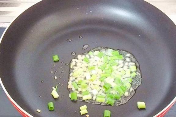 3.下面开始做汤,起锅烧油,5成热之后放上蒜片,爆香。然后倒入西红柿丁,炒出汁,然后加清水,大火烧开就行。