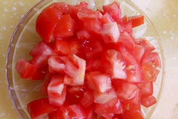 1.洗净的西红柿先给它切片再切丁,这时候有人会担心,不去皮有农药残留,没关系,你可以给西红柿表面打上十字花刀,用开水一烫,去皮也很容易,然后再切丁就可以。