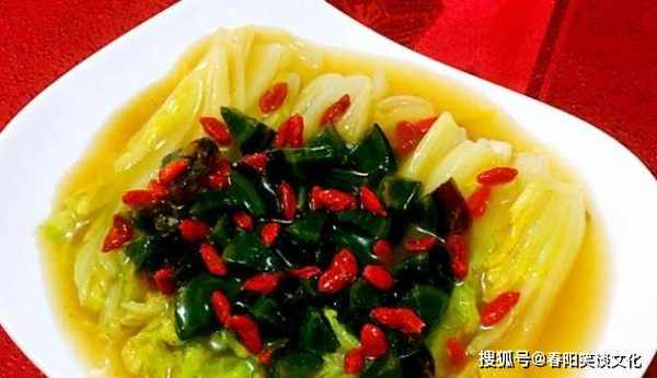 3.将娃娃菜摆盘,放上皮蛋和枸杞。