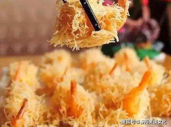 4、先将鲜虾用清水冲洗干净,然后裹上一层酥皮糊,一个个弯成椭圆形,放入50%热的油锅中炸熟,捞出控油。
