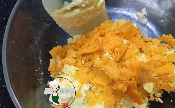 1、流沙馅这里是用的黄油、咸蛋黄和鸡蛋黄,加入鸡蛋黄一起,这样馅料的色泽和口感更棒。