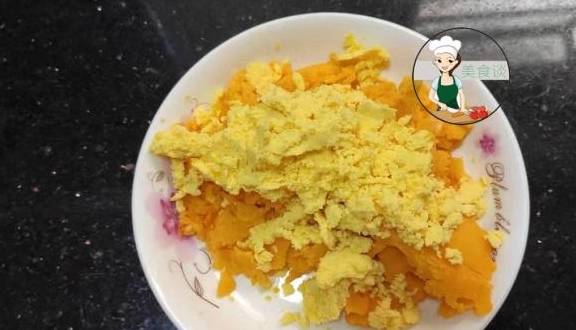 2、鸡蛋黄也是用刀碾压,装盘备用。