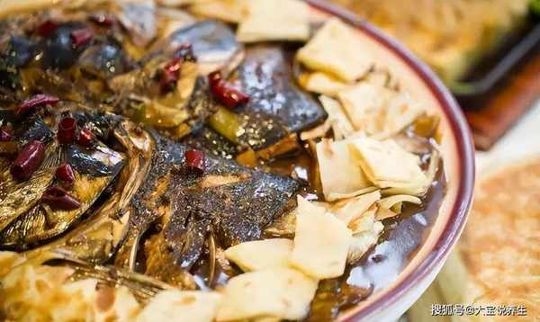 材料:500克鱼头/400克煎饼/300克白菜叶,油/盐/葱/姜/蒜/八角/10毫升酱油,15毫升香醋/10克糖/10毫升料酒/50克香菜