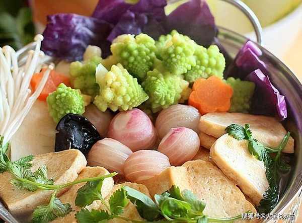 -材料-老豆腐、樱桃萝卜、紫甘蓝、宝塔菜花胡萝卜、黑蘑菇、金针菇、冬笋、香菜、红薯粉条、盐、蔬果香料粉、胡椒粉