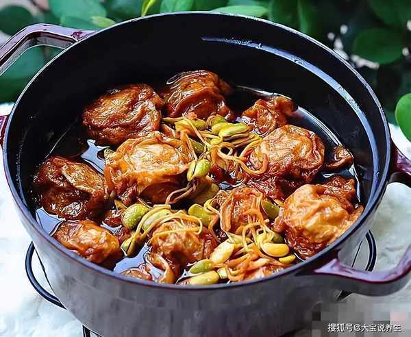 6、将面筋泡入锅中,盖上锅盖,全程以小火慢炖25分钟。