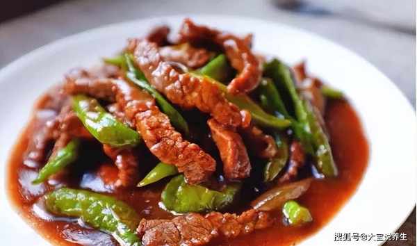 4.当辣椒开始变色时,加入牛里脊肉和辣椒一起炒。待辣椒变软起皱时,加入适量的盐和味精,翻炒片刻,即可装盘。
