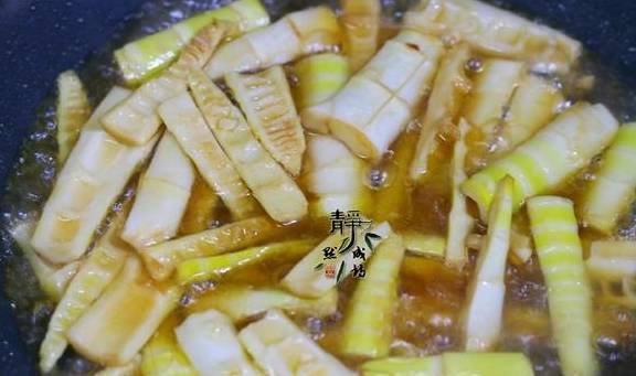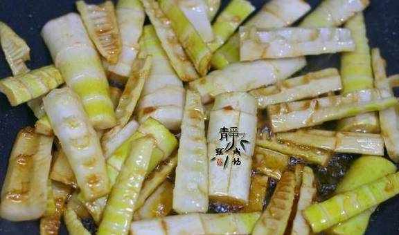 6、待笋稍稍发软时,烹入酱油,迅速翻炒均匀。