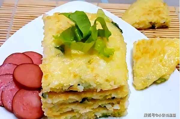 3.平底锅刷一层薄油,倒入米和蛋液,刷平锅底;