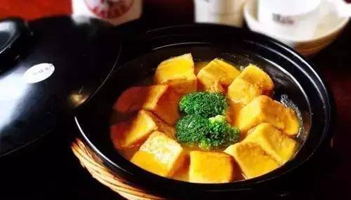 3、色拉油烧热至80%,将10块豆腐放入锅中煎至焦黄,沥干油,放入烧热的瓦煲中。