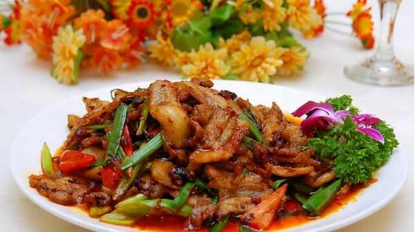 3、锅内加入适量油烧热,加入切碎的姜、蒜、干辣椒,大火炒熟,加入一小勺郫县豆瓣,将猪肉倒入锅中,炒至变色,加入老干妈辣椒油,豆豉一小把,大火炒匀;加入剁碎的花椒和洋葱,继续翻炒均匀,加少许白糖提味,加入适量鸡精拌匀,即可食用。